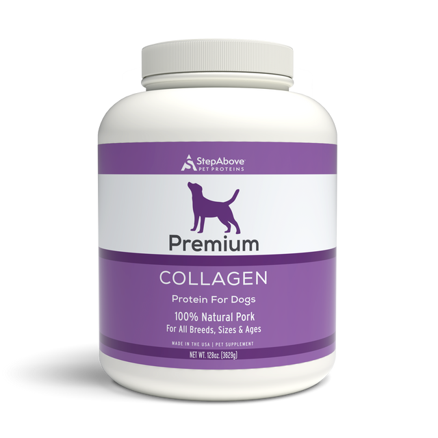 With only a single sourced premium ingredient, Step Above Proteins collagen protein powder for dogs helps improve aching hip and joints, promote lean muscle growth, manage allergies, maintain a healthy coat, improve the digestive function and increase overall stamina. About one-third of the protein in your dog's body is collagen. As your dog's body ages, collagen productions slow down. In older dogs, this is demonstrated as arthritic issues start to surface, and skin and coat quality can decline. At all ages, supplementing collagen into your dogs diet provides fantastic preventative healthcare benefits. From young pups to seniors, our uniquely formulated collagen helps promote lean muscle growth, prevent bone loss, relieves joint pain, and promotes a healthy immune system. Collagen provides added benefits of increased stamina, mood and appetite. While humans take collagen peptides, our collagen is specially formulated for dogs to ensure they love the taste, and you love the ease. Just sprinkle over wet or dry food once or twice daily per directions to give your pup the pep in their step they need! You will see a positive change in your dogs health and behavior in a matter of weeks. Veterinarian recommended, doggy approved. 100% All natural, non-GMO, and grain free. Introduce Step Above Proteins collagen powder into your feeding regimen today!